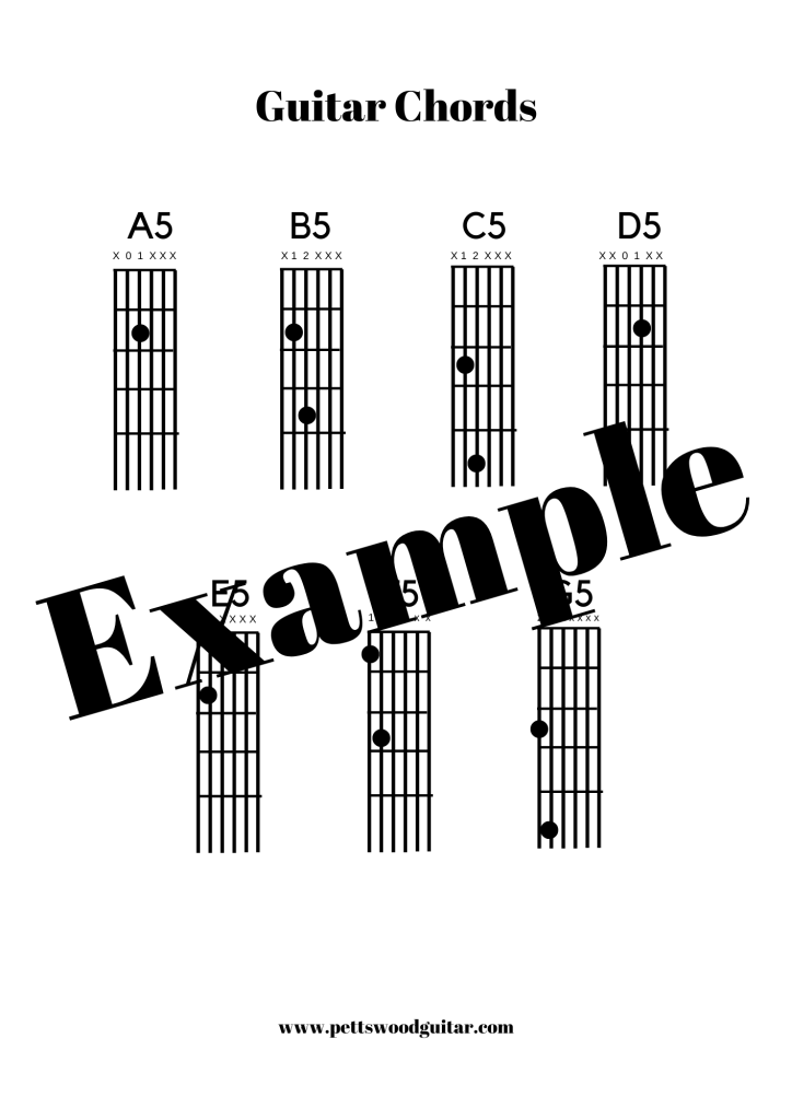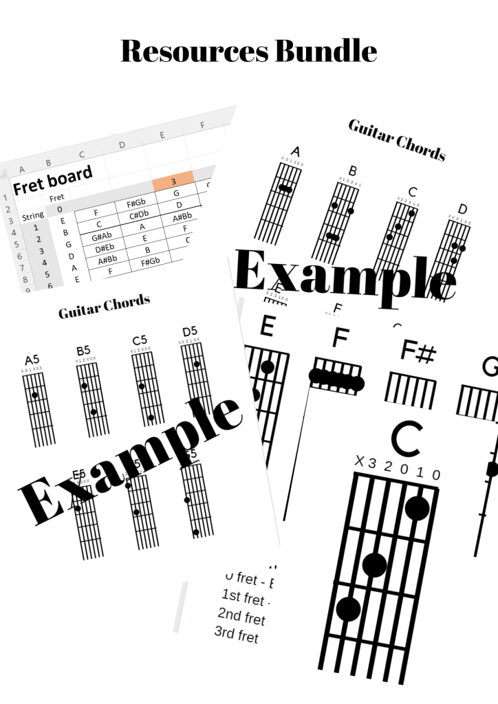 All 5 resources at a discount. Open Chord Chart / Power Chords / Barre Chords/fretboard & A4 sized chord chart.